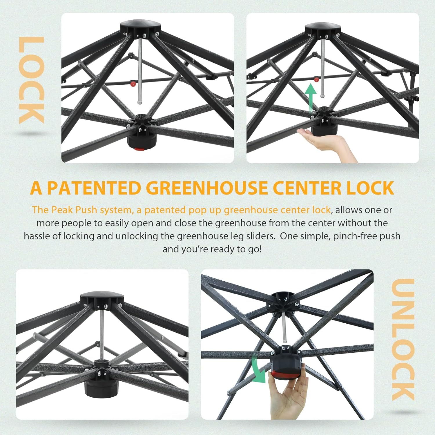 - EASY SETUP: This pop up greenhouse with patented center lock technology supports one person setup in seconds. The pre-assembled frame and innovative Peak Push locking system delivers a quick setup. No tools required. Whether you're a seasoned gardener or just starting out, the EAGLE PEAK pop-up greenhouse for outdoors saves you time and hassle