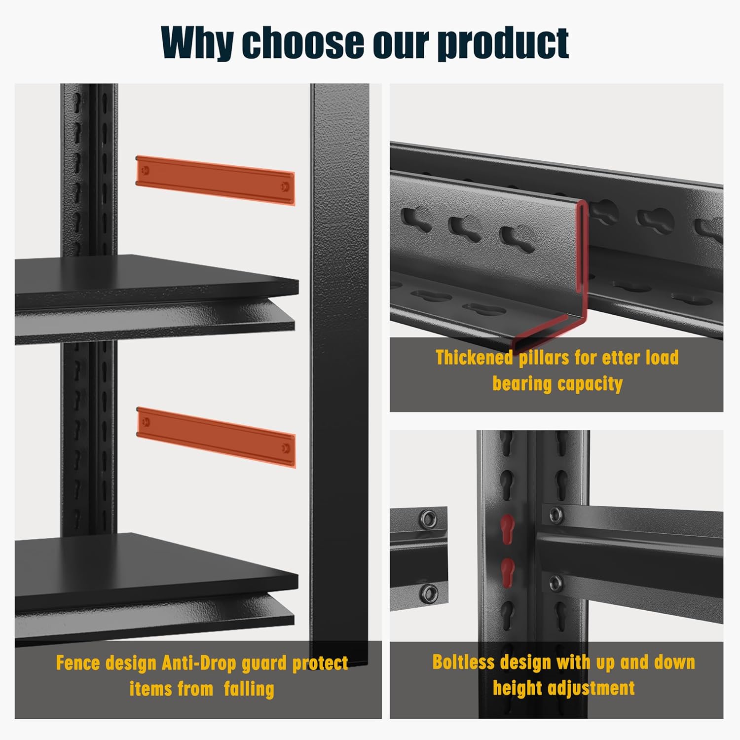 - ใGarage Shelving Heavy Dutyใ๏ผOur metal storage shelves are made of heavy-duty steel and have been upgraded to double layered columns, each with supporting ribs, and the surface of the shelves is coated with high-quality powder coating. It is not only sturdy and durable, but also ensures that the shelf maintains its appearance and performance in various environments. Each shelf can carry up to 900 pounds, and the maximum weight capacity of 4500 lbs.