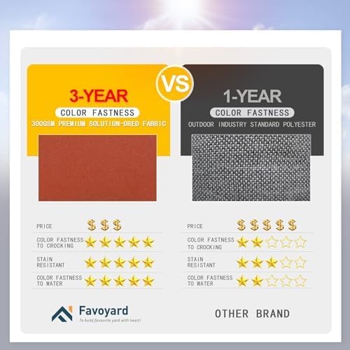 - 3-year Color Fastness - Our patio chair cushions adopt 300GSM High Density polyester fabric, thanks to the superb coloring technology, we proudly say the fading resistant is 20 times that of ordinary products, Favoyard outdoor seat cushion for patio furniture is a perfect decor in garden, patio, beach and etc.