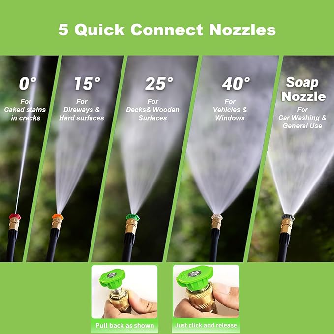 - UPGRADED ACCESSORIES: The Commowner portable pressure washer 2.0 comes with top-of-the-line accessories for a thorough cleaning experience; Navigate with ease using the 33-foot real rubber hose, choose from 5 QC nozzles (0ยฐ, 15ยฐ, 25ยฐ, 40ยฐ, soap) for different cleaning needs, and enjoy additional features like the 500ml detergent tank, metal lance, spray gun, cleaning pin, welcome guide and 20-foot electric cord