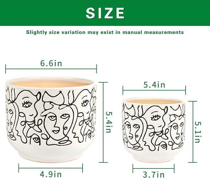 Docrin Plant Pots Indoor with Drainage : 6.6+5.4 Inch Ceramic Flower Pots for Plants - Set of 2 Modern Decorative Face Planters for House/Office/Gift - /Black and White