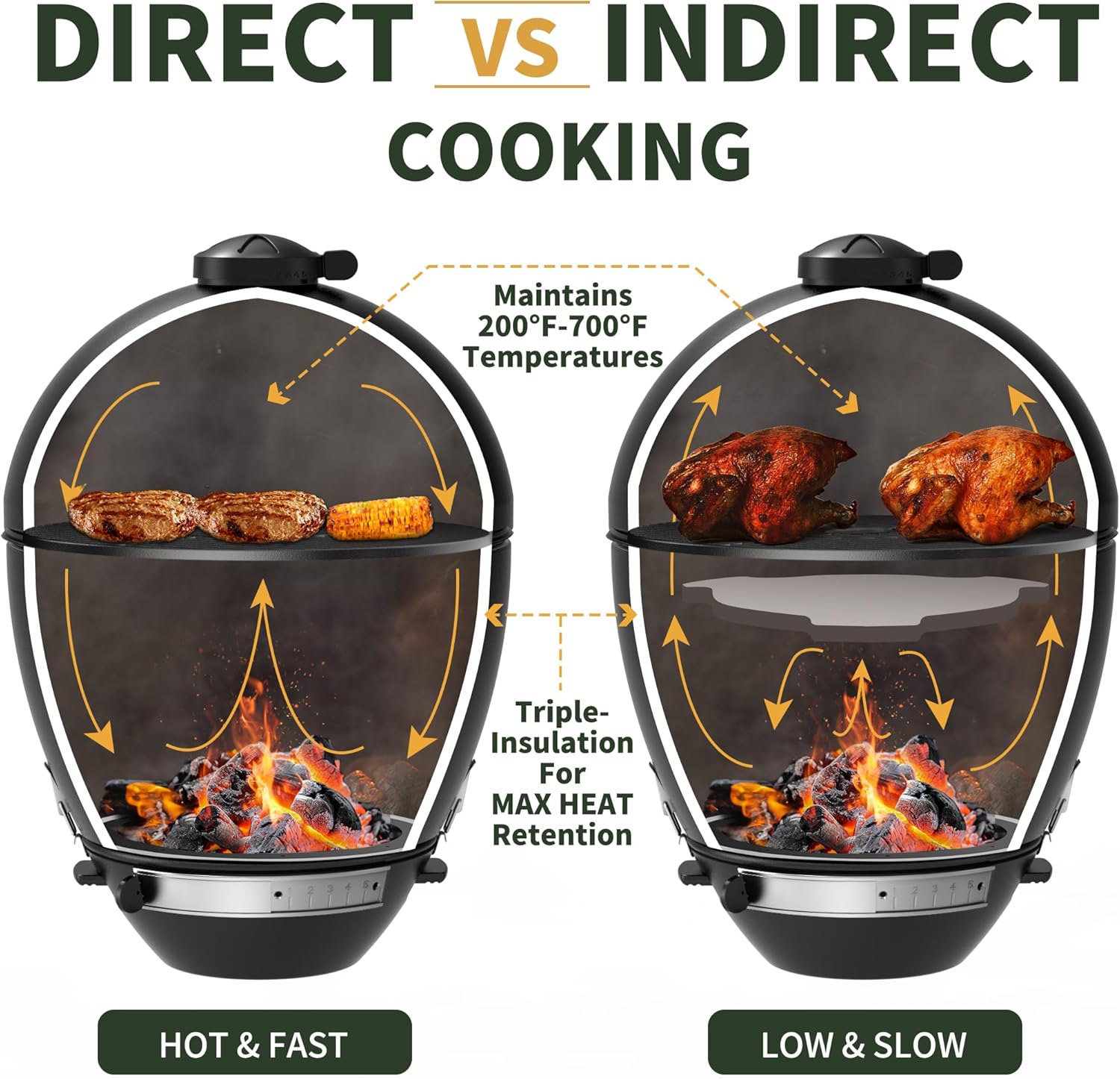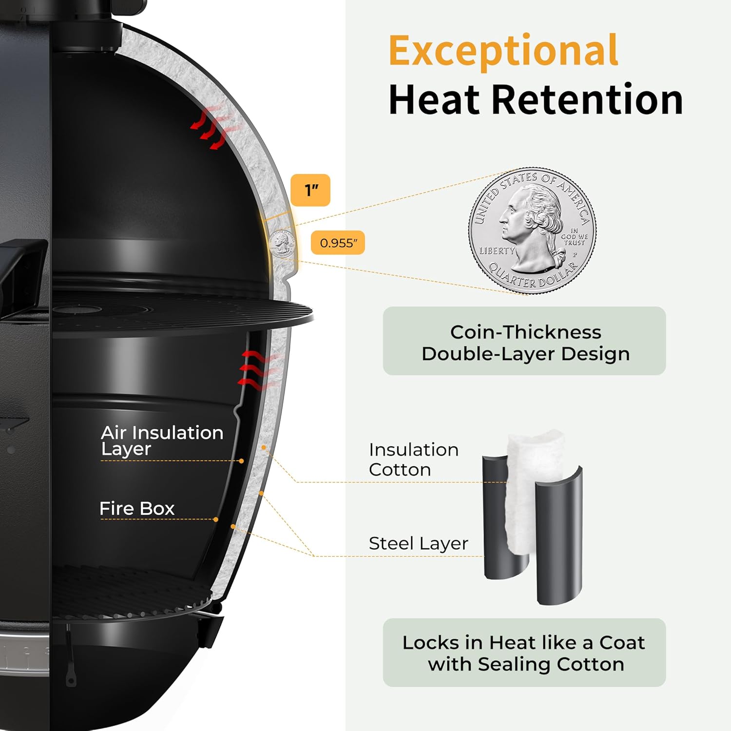 - KAMADO CHARCOAL GRILL: Ideal for intense grilling and slow-cooking, our Kamado-style grill feature a coin-thickness double-layer design and mesh fiberglass gasket for superior heat retention, ensuring your food cooks evenly every time