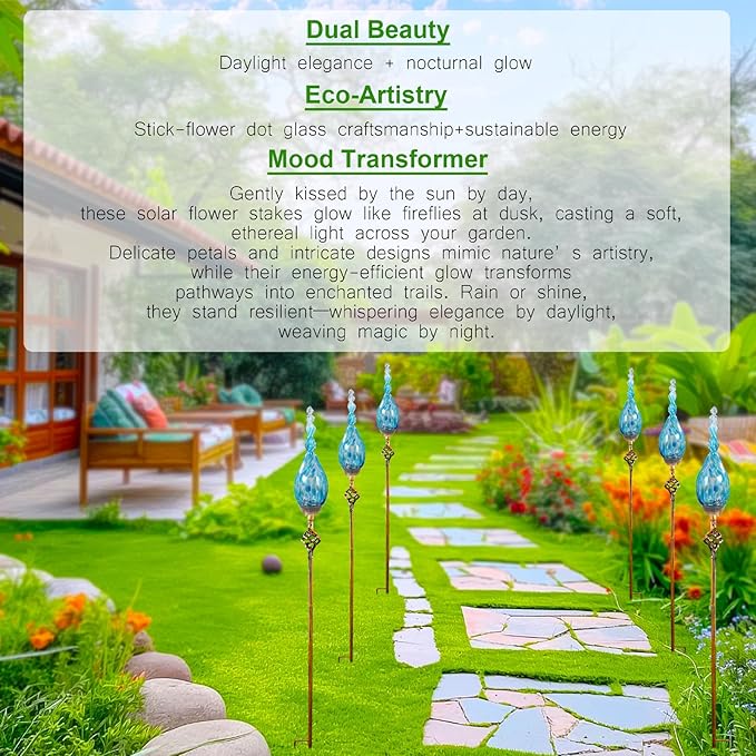 - These solar garden lights feature hand-blown flame-shaped glass tops with sleek metal poles.It looks like a flame statue. These glass flame garden stakes they exude artistry through flowing light and shadow, Decorative lawn stakes serving as exquisite decor by day and infusing for your garden, lawn, or yard with warmth when lit at night.