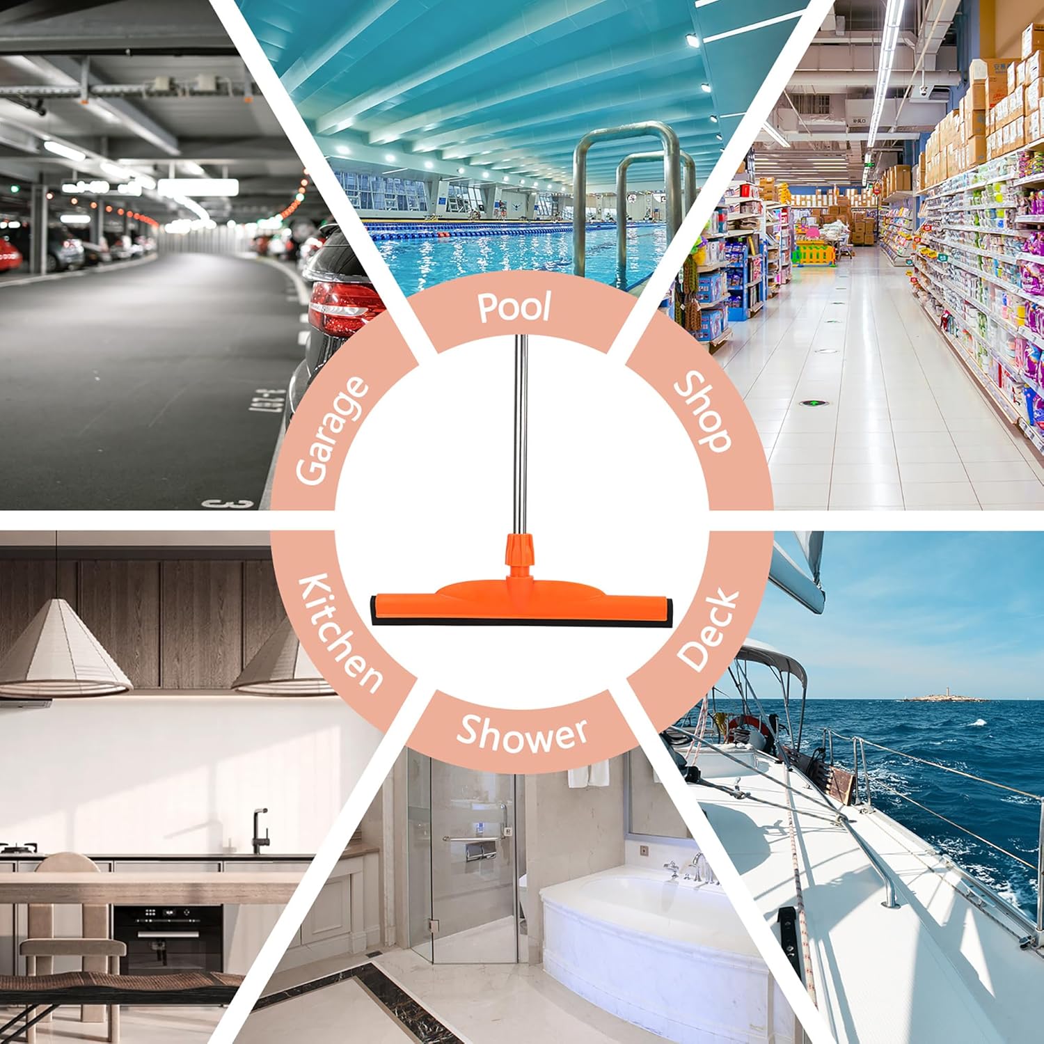 - Floor Squeegee Broom Multipurpose: Floor squeegee scrubber with 51โโ stainless steel pole - versatile cleaning for multiple surfaces, to dry floor surface efficiently and remove dirt and hair easily. Suitable for garage courtyard shower bathroom pet hair fur floor marble glass tile water foam cleaning. Whether youโre dealing with concrete floors, tile floors, shower areas, decks, or commercial spaces like garages, hospitals, hotels, and pools, this floor squeegee handles it all with ease