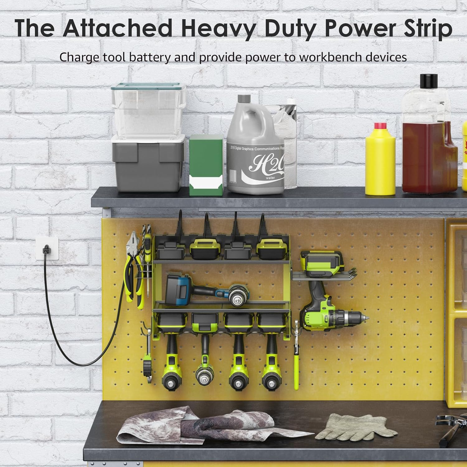 - Wall mount power tools organizer come with 6 slots drills holder, 4 hooks, 2 shelves and drill bit rack, built-in power strip, 3 layer structure can keep different rechargeable tools organized in the work area and save your bench space.