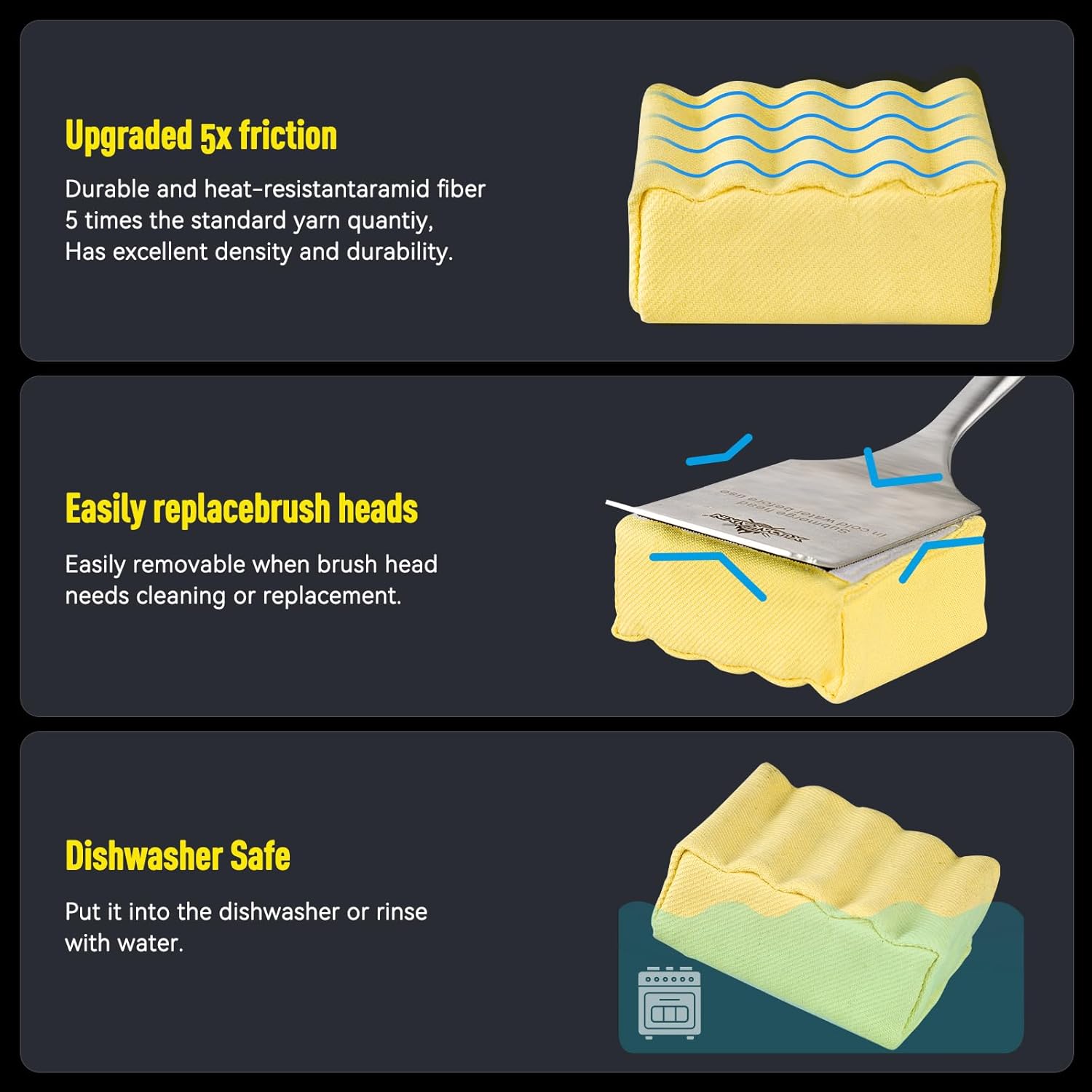 - 【Replaceable Grill Brush Head】Easily removable when brush head needs cleaning or replacement,Rinse with water or dishwasher