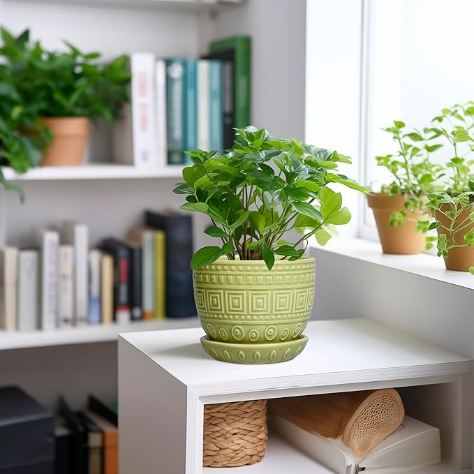 G EPGardening Ceramic Pots for Plants - 5.5 Inch Round Ceramic Planter for Indoor, Boho Succulent Pot with Drainage Hole and Plant Saucer, Gift for Plant Lover, Garden Home Desk Decor, Green