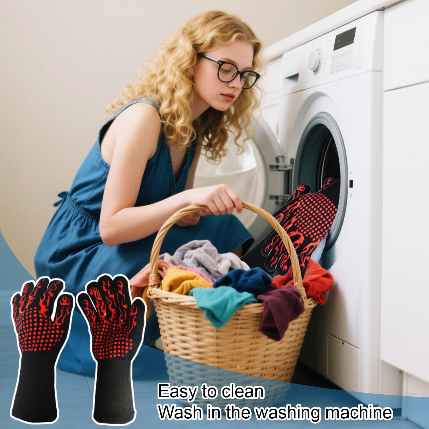 - NOTE: Our cooking gloves possess high heat resistance and flame retardant properties. But it is not permanent protection against fire and heat. Avoid prolonged direct contact with open flames or extremely hot objects.
