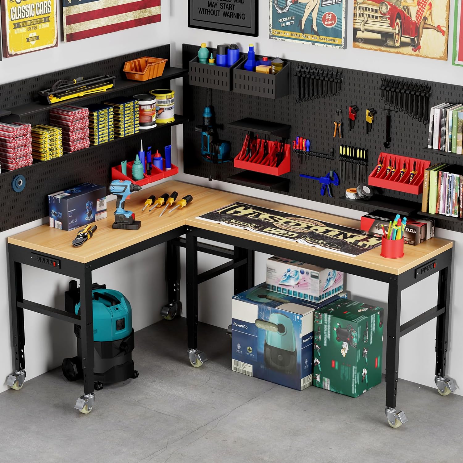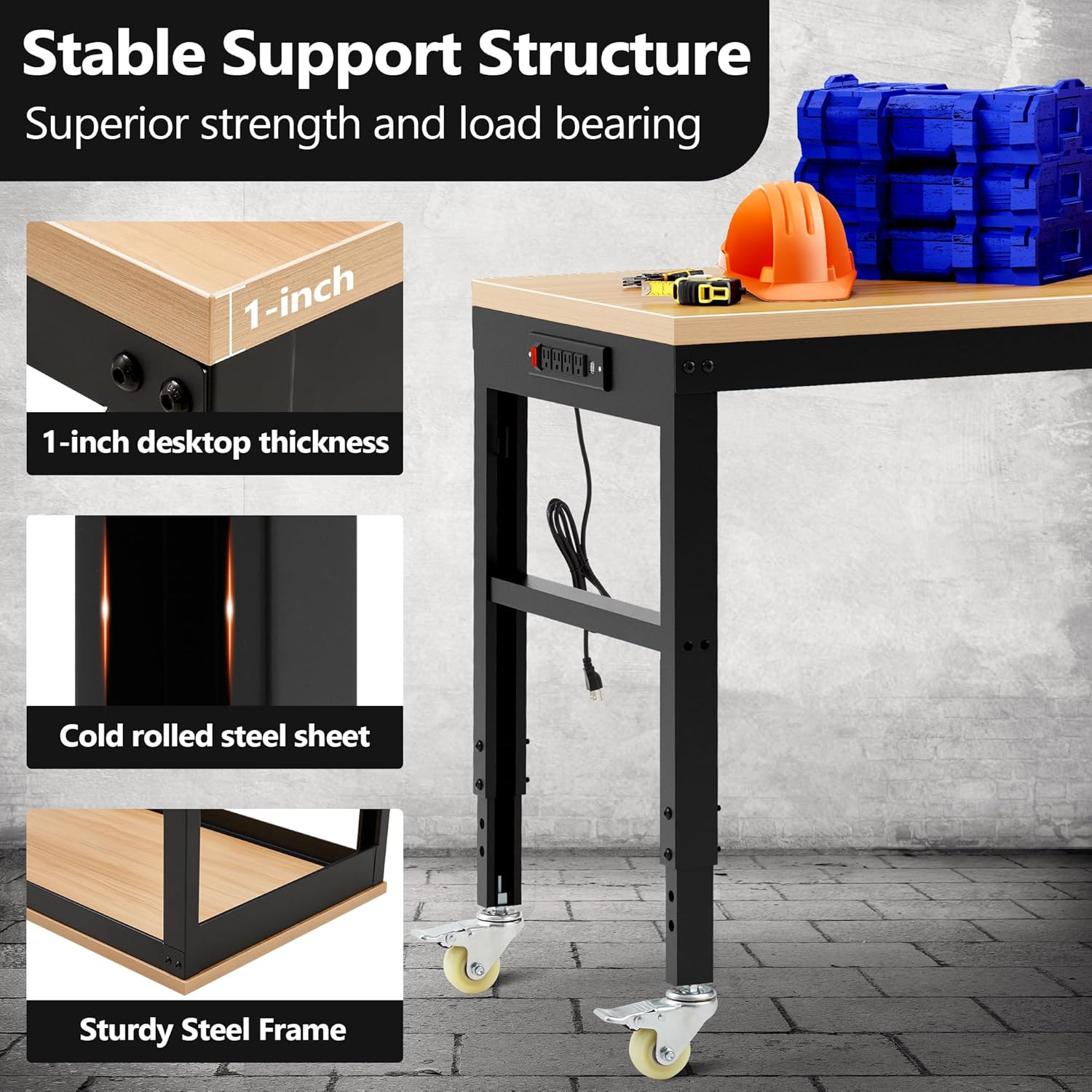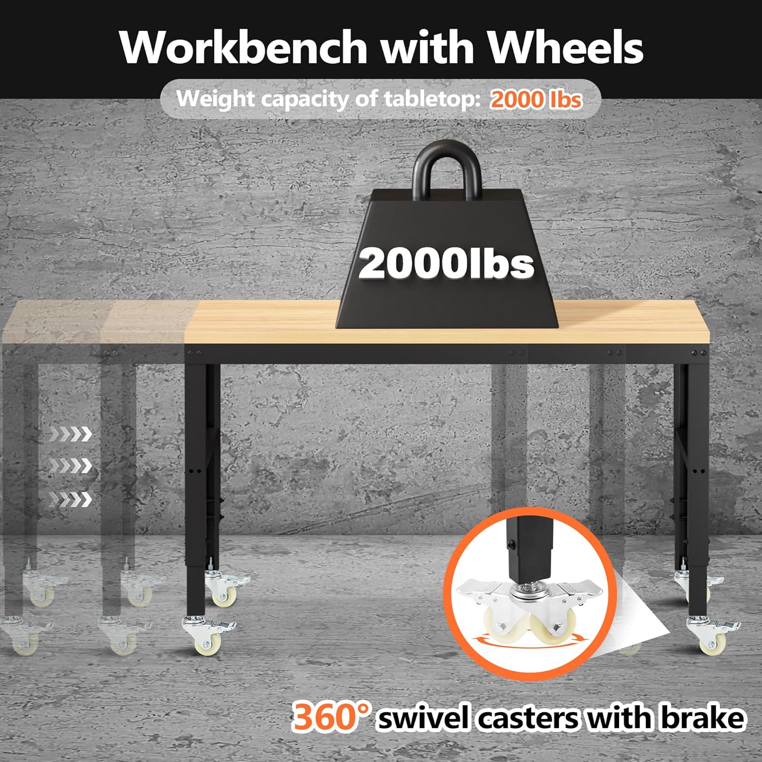 60” Adjustable Workbench,Heavy Duty Wood Work Bench 2000 Lbs Load Capacity,Work Table with Power Outlet and Wheels for Garage, Workshop, Office, Home