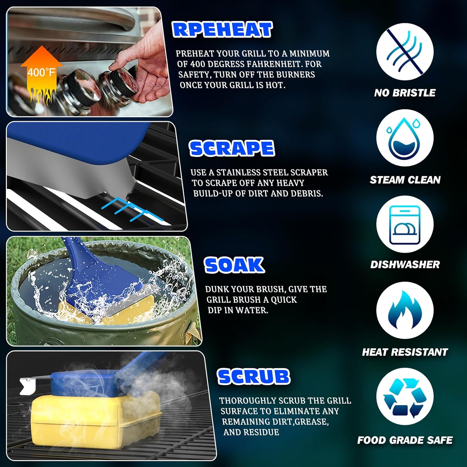 - For optimal performance used for people who have never used a steam cleaning brush before, heat the grill to 400ยฐF, scrape off excess grease and then the stainless steel scraper is used in in water, and press firmly to ensure full water absorption. Then proceed with steam cleaning for quick and effective deep cleaning within minutes.This usage pattern can effectively solve the problem used by whom worried about brush bristles remaining on food or not cleaning thoroughly enough due to the use of traditional cleaning tools.