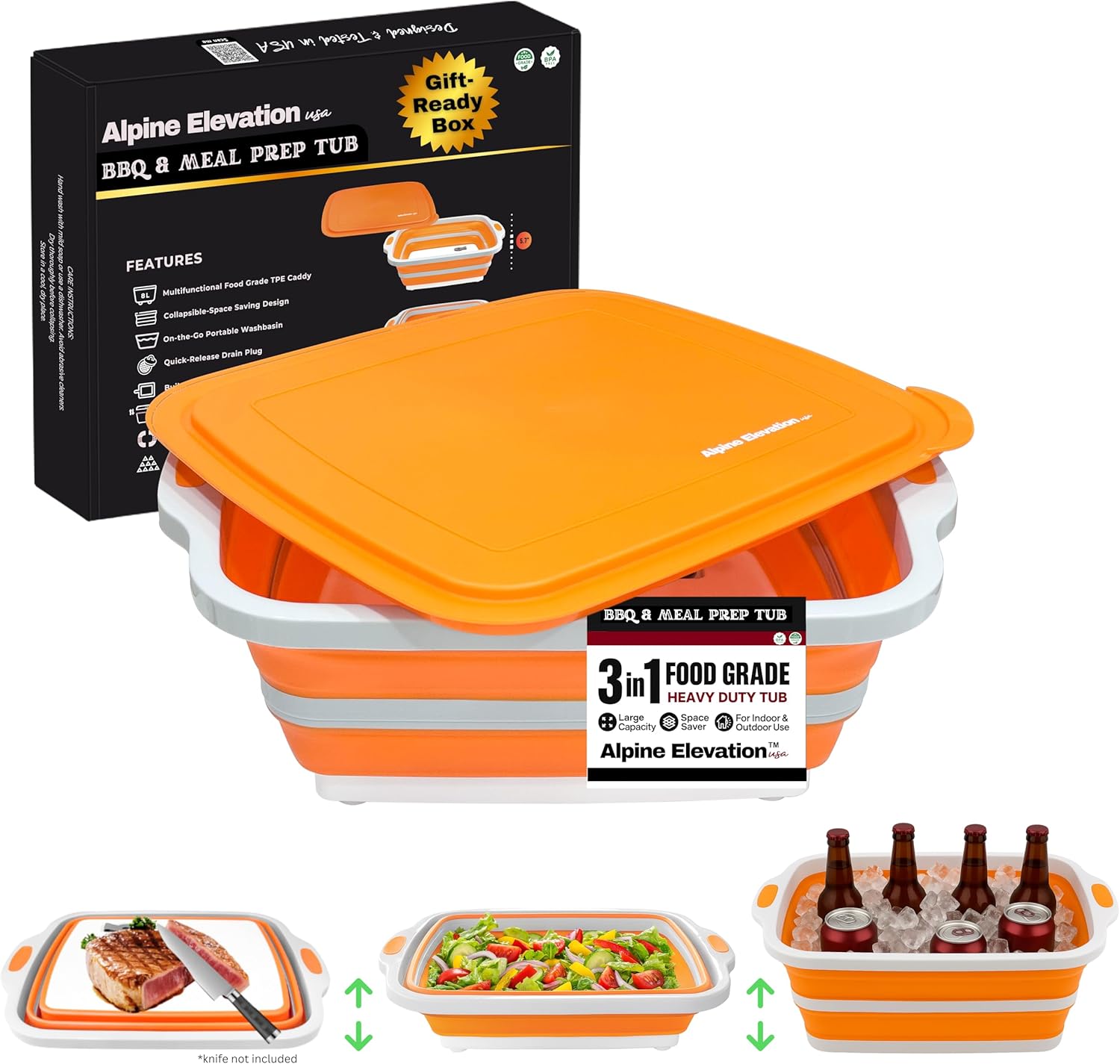 Collapsible Large (8L) BBQ Marinating Tub w/Cutting Board | Multipurpose Food-Grade TPE Prep Tub w/Lid | Built-in Colander & Drain Plug - for Camping | Tailgate | Picnic - Bold Orange