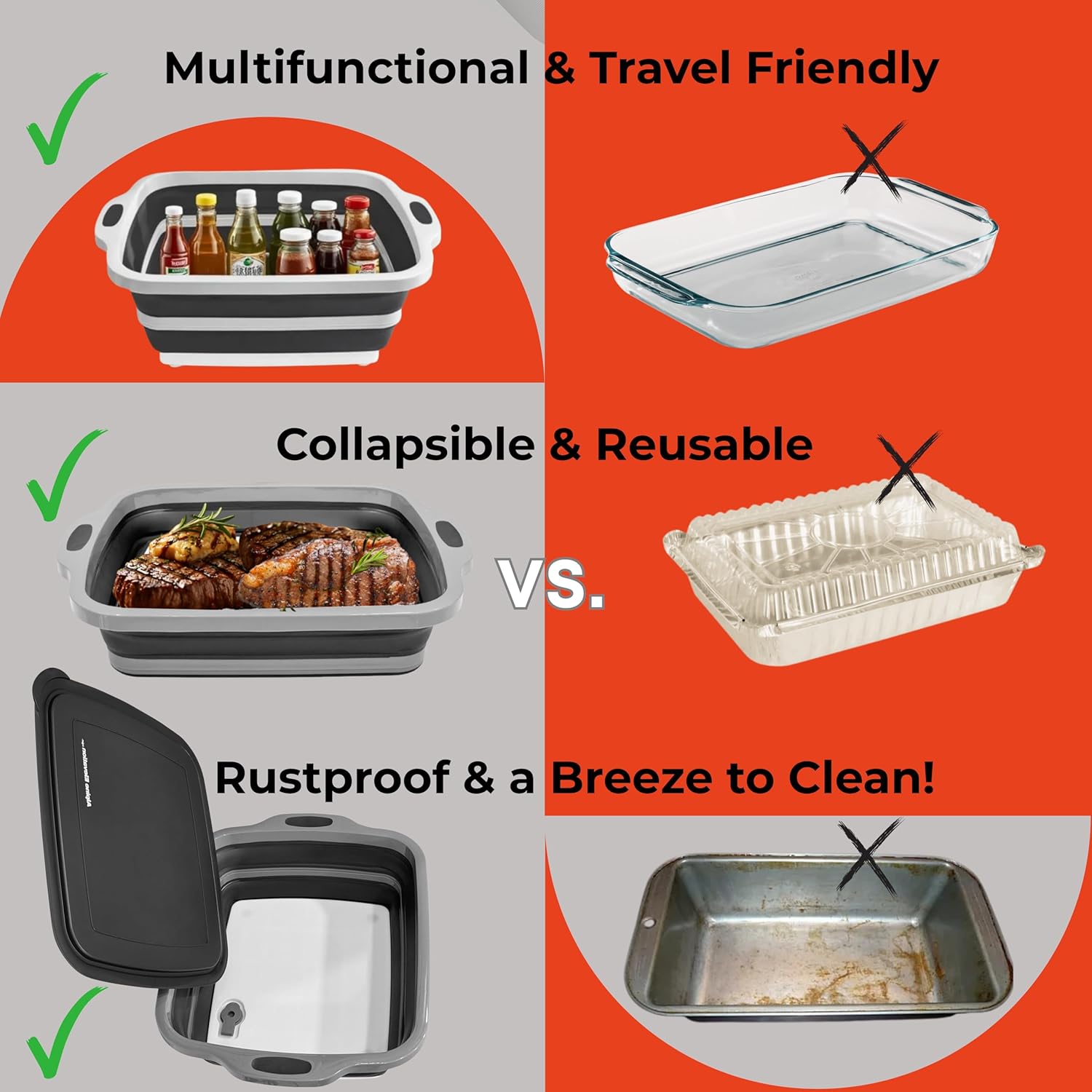 - 3-in-1 BBQ Prep Tub + Lid โ Transforms into a wash basin, marinade tub, or light-duty cutting board. Fully collapsed form doubles as a serving tray.