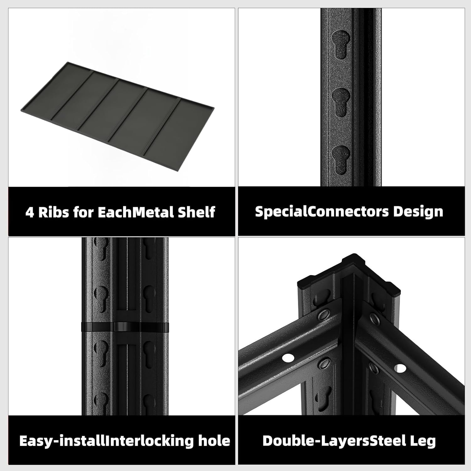 - 5 Tier Metal Shelf Unit: The garage shelves are constructed with reinforced, double-layered uprights that deliver exceptional load-bearing capacity, ensuring long-term use and stability. Each shelf incorporates 5 reinforcing rods , enhancing stability and ensuring even weight distribution for the safe storage of heavy items.