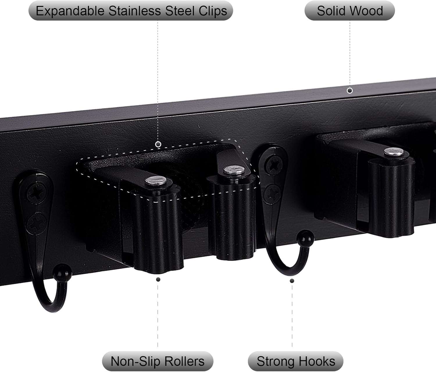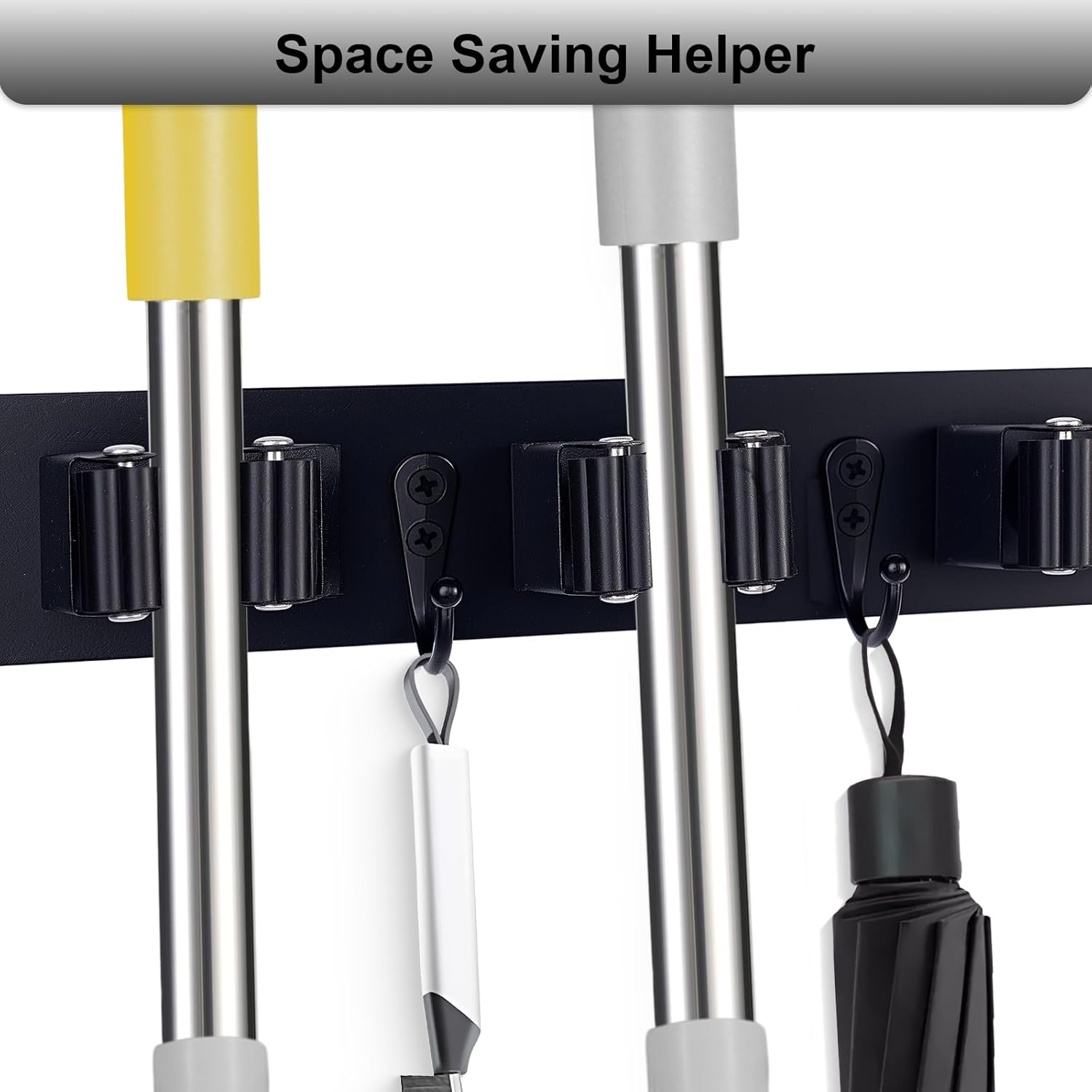 - Effective Space-Saving: This wall-mounted broom and mop holder keeps your brooms, mops, umbrellas, vacuum and other long-handled tools neatly organized on the wall. It's perfect for keeping all your tools in order and saving space, especially for those who want to keep their laundry room tidy and clutter-free.