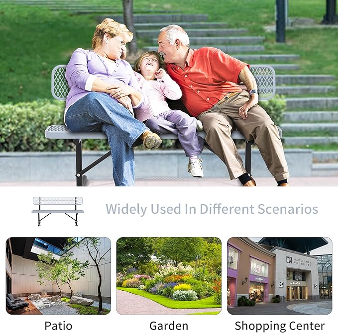 - Large Size Metal Bench: 3 sizes for you to choose - 4FT/6FT/8FT. The garden bench provides enough space for 2-6 people to sit comfortably. This outdoor bench provides comfortable sitting for gardens, porches, parks, patios, lawns.