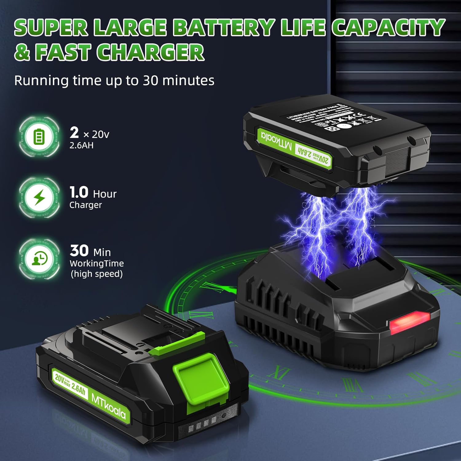 - 【Significant Highlights of MTK】Upgrade Powerful Motor& High Battery Capacity 2*2.6Ah & Fast Charger&Quiet and Lightweight Design,up to 450 CFM and150 MPH,effectively improving air volume and wind power. It can operate continuously for 30-35 minutes,outperforming 99% of sellers on the market who offer a battery life of 10&20 minutes, you can take care of your garden and backyard more efficiently,which is far beyond the market 2.0 Ah, sufficient battery capacity can help you work efficiently.