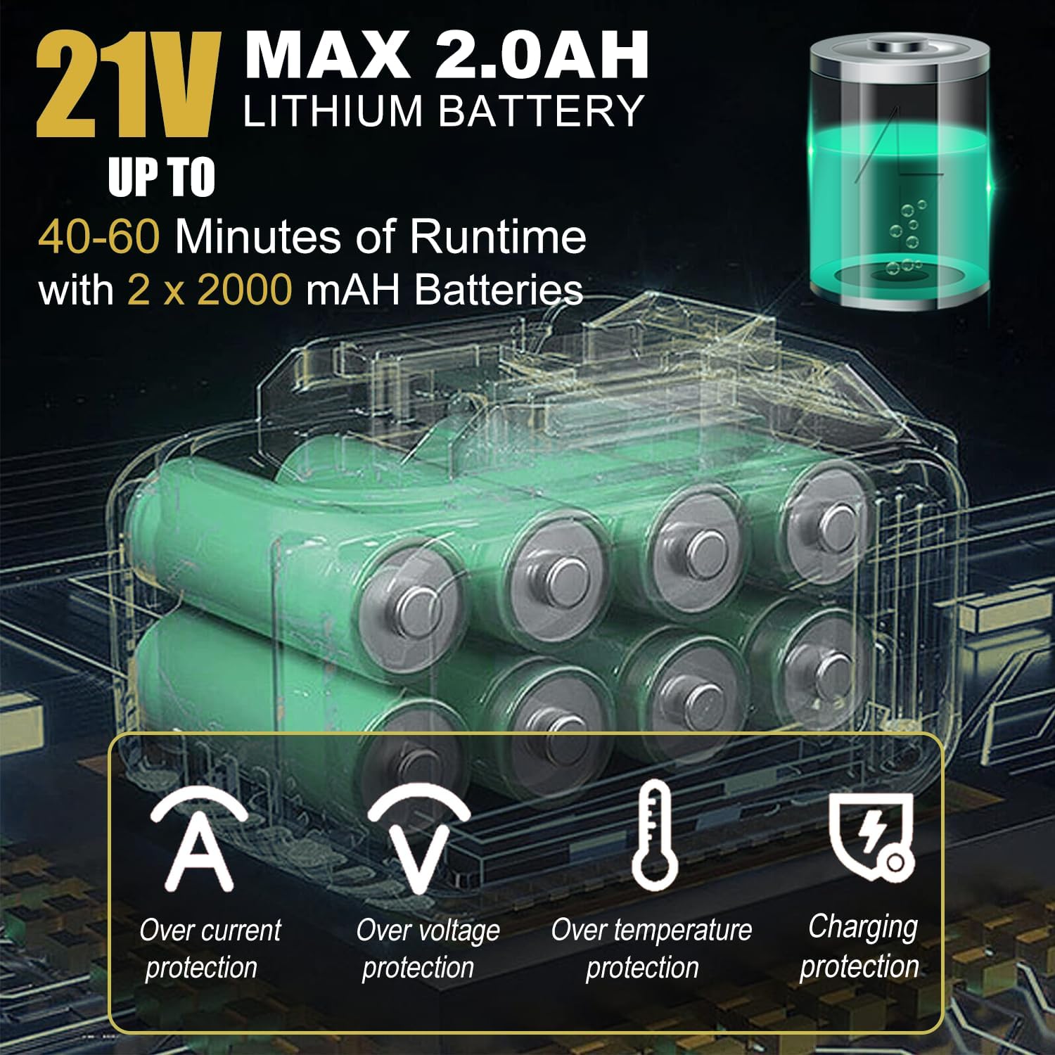 - DUAL HIGH-CAPACITY BATTERIES: Say goodbye to battery worries! cordless weed trimmer provide 2 powerful 21V 2000mAh batteries. This ensures hours of uninterrupted cutting, easily completing lawn trimming work. Experience endless power and seamless operation with our weed whacker battery powered