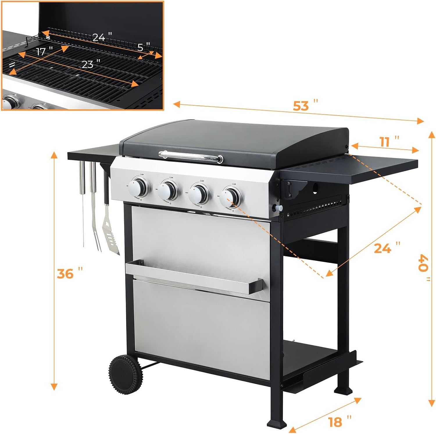 - 【Compact Design】At 52.5" L x 17.8" W x 40.1" H, our outdoor gas grill is designed to fit seamlessly into your outdoor area, blending convenience with style