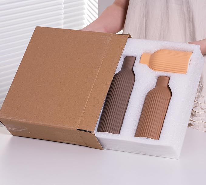 - Unique Ribbed Design : Featuring a distinctive ribbed texture and a warm brown finish ,these vases bring a modern yet timeless aesthetic to your home.The vertical grooves create a visually striking pattern , making them ideal for farmhouse ๏ผpampas grass decor styles.๏ผLength x Diameter=9.96 x 3.35", 7.87 x 3.31",5.79 x 3.31",the dimensions are all measured by hand, So there may be some small deviations.)