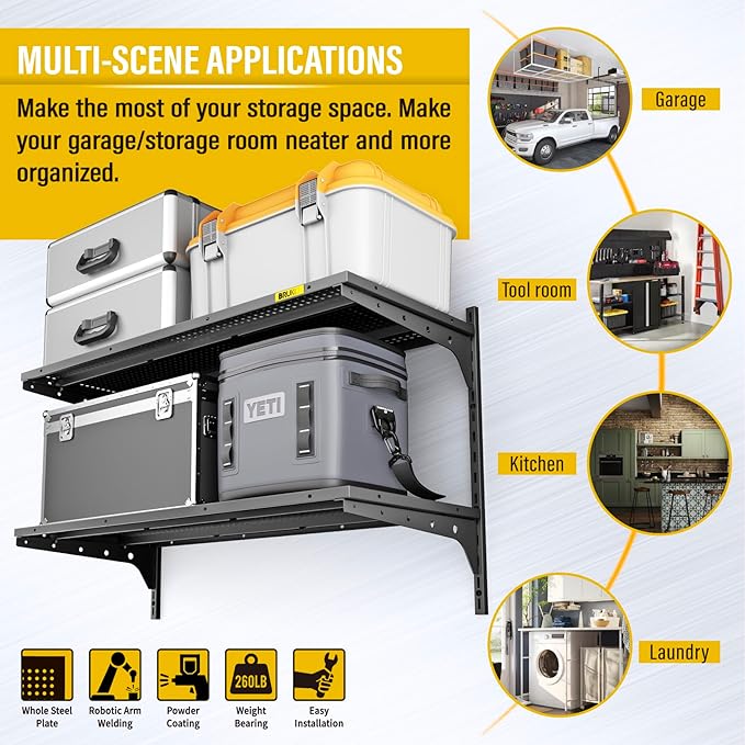 - 260lb Load Tested: Each panel of our Brukid heavy-duty wall shelf has been rigorously tested to support 130 lbs, with the 2-tier (1.3x3ft) unit offering a combined weight capacity of 260 lbs. Built for strength and reliability, it's perfect for heavy tools, equipment, or storage needs.