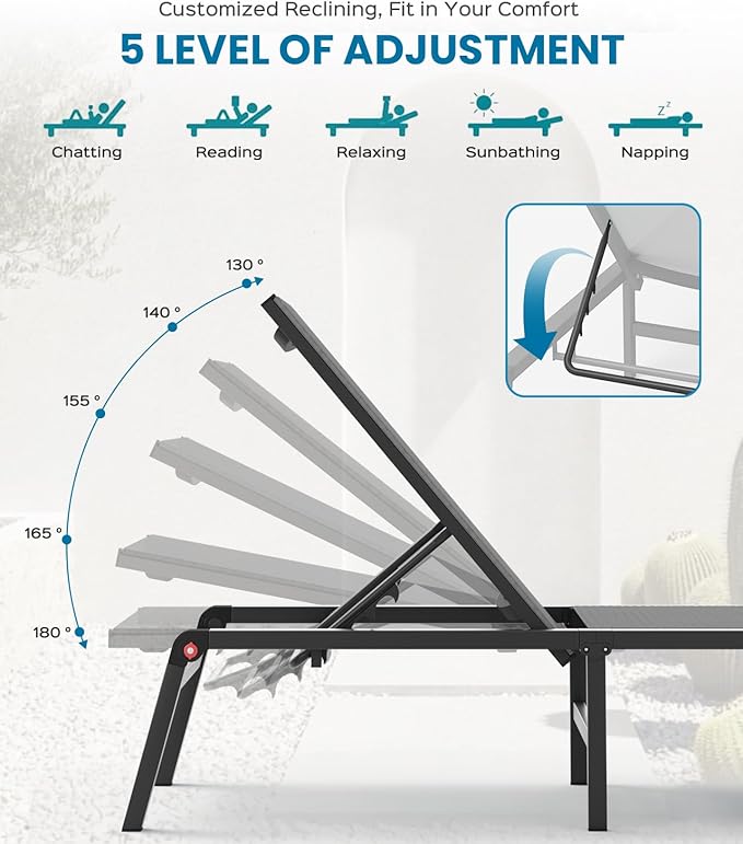 - 5-Position Adjustable Backrest –Experience ultimate comfort with our patio lounge chair’s five recline options. Whether you’re reading, napping, or simply relaxing, adjust the backrest from upright to fully reclined to find your perfect angle