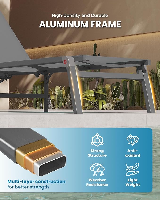 - Rust-Resistant Aluminum Frame – Built with a durable aluminum frame covered in an anti-rust powder coating, this pool lounge chair withstands outdoor elements. Its robust design provides longevity and low maintenance for carefree outdoor relaxation