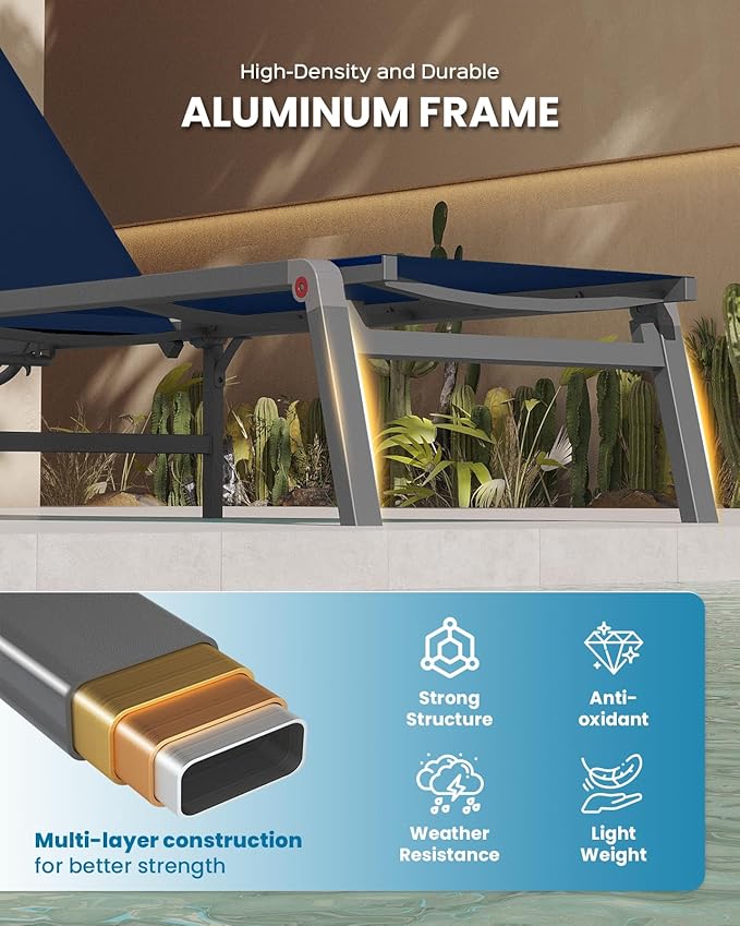 Chaise Lounge Outdoor, Foldable Aluminum Pool Lounge Chairs with 5 Positions Recliner - Free Assembly - Patio Chaise Lounge Chair for Poolside, Beach, Yard (NavyBlue)