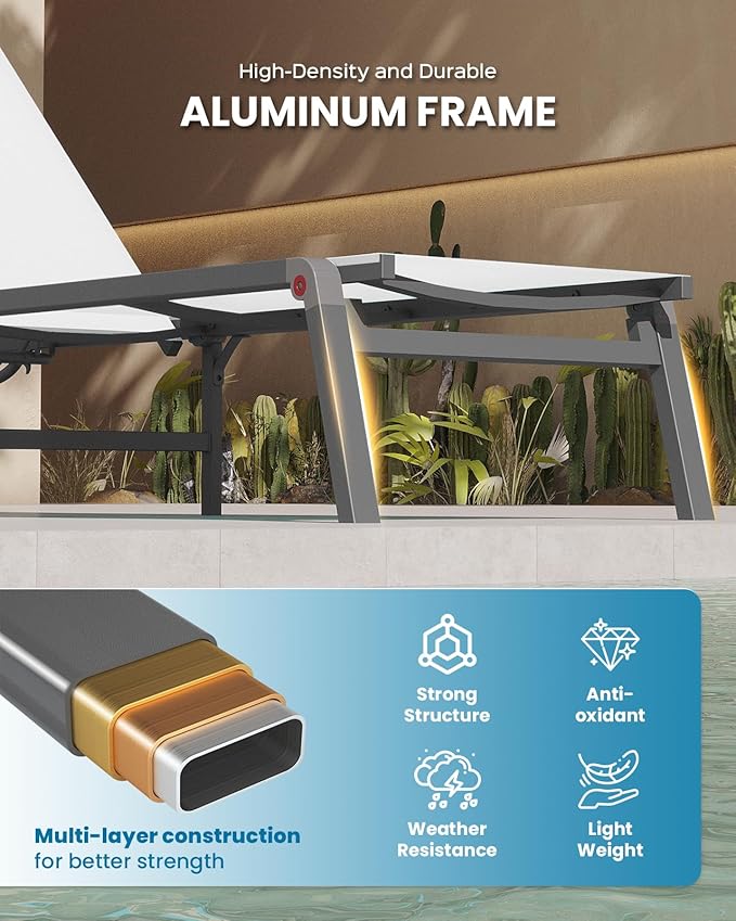 - Rust-Resistant Aluminum Frame – Built with a durable aluminum frame covered in an anti-rust powder coating, this pool lounge chair withstands outdoor elements. Its robust design provides longevity and low maintenance for carefree outdoor relaxation