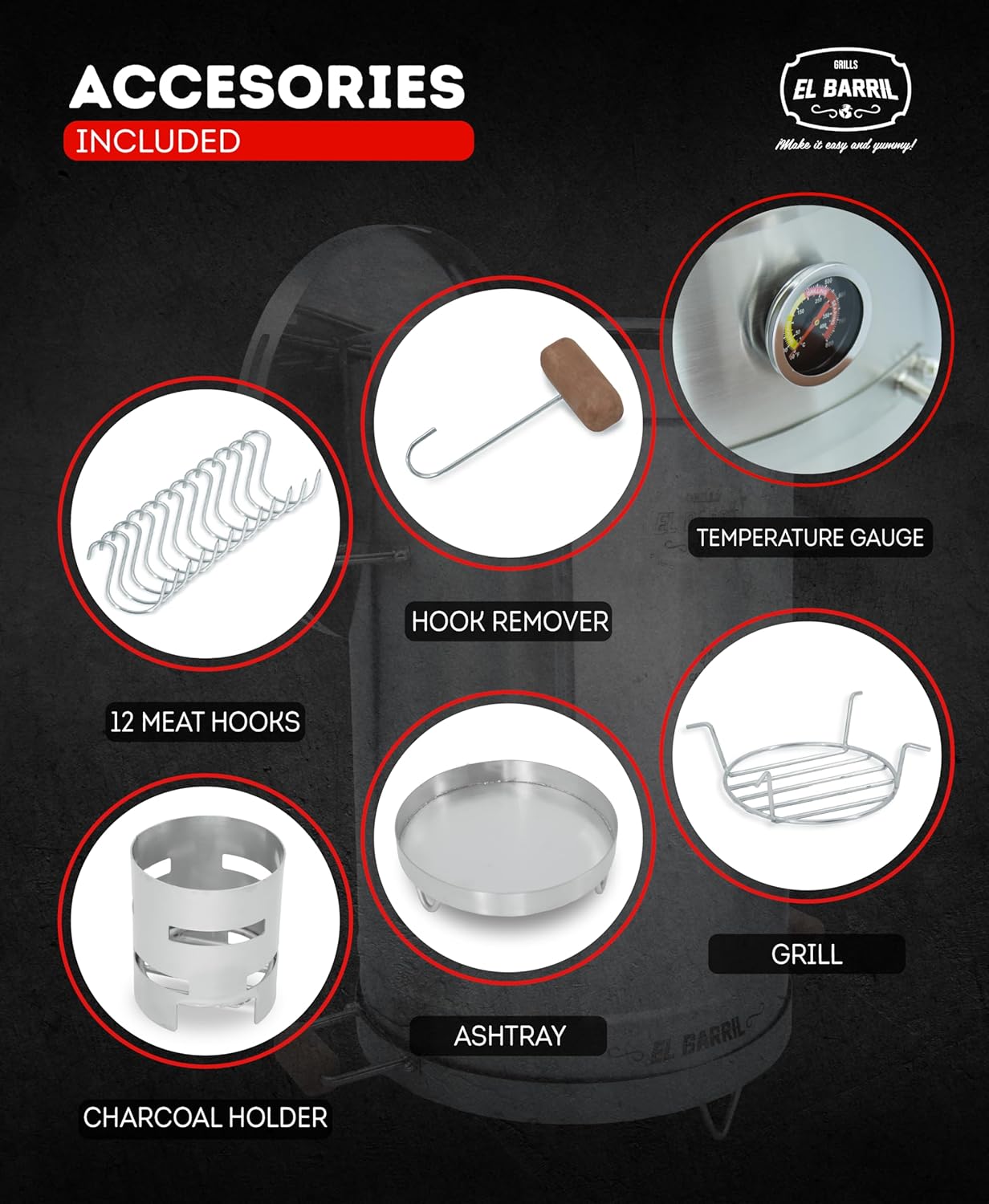 El Barril Lite Medium Barrel Smoker Grill, Stainless Steel 430, 30 lb Capacity, 12 Meat Hooks, Upper Grill and Handler, Portable Charcoal BBQ (Lite 30LBS Medium)