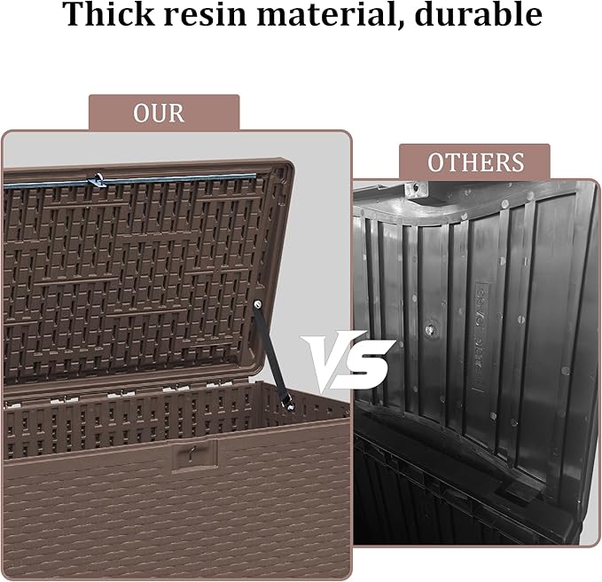 - Built to withstand any weather, our deck box is made from resin that offers waterproof, corrosion-resistant protection, and UV-resistant. No matter the seasonโbe it scorching sun or heavy rainโthis box will keep your items dry.