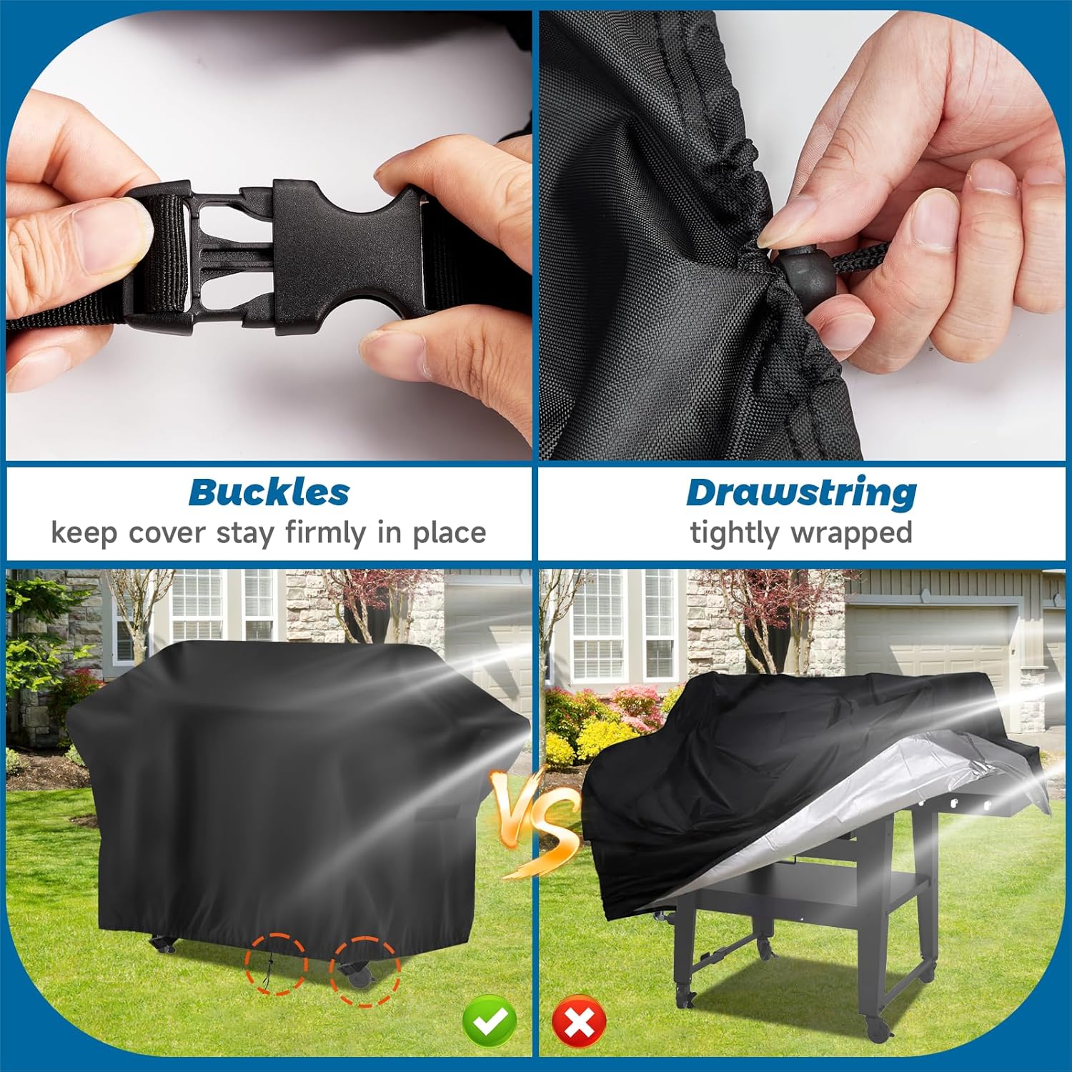- Wind Design:Featuring Velcro closure straps on both sides and a bottom drawstring, this daytona 68in griddle cover securely fastens.Four corner buckles keep cover stays firmly in place even during strong winds.