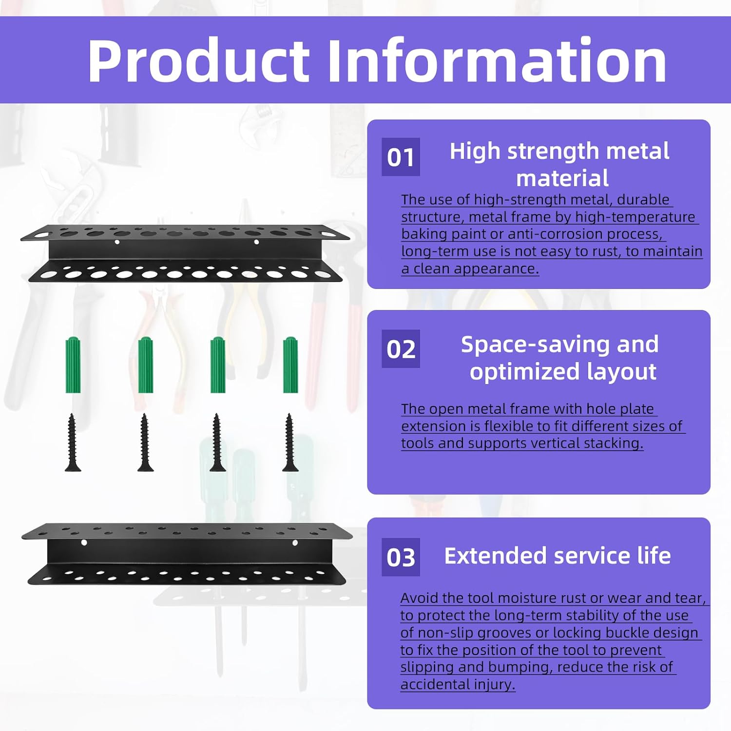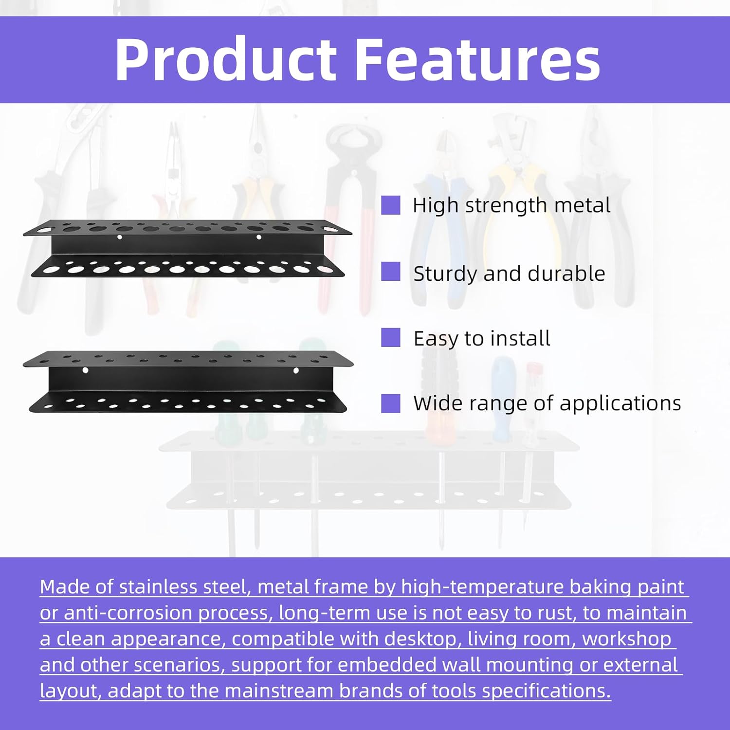 - Anti-Rust & Durable Material – Made with premium aluminum alloy and coated with anti-oxidation finish, this tool organizer resists corrosion and daily wear, ensuring long-lasting use in garages, workshops, or humid environments