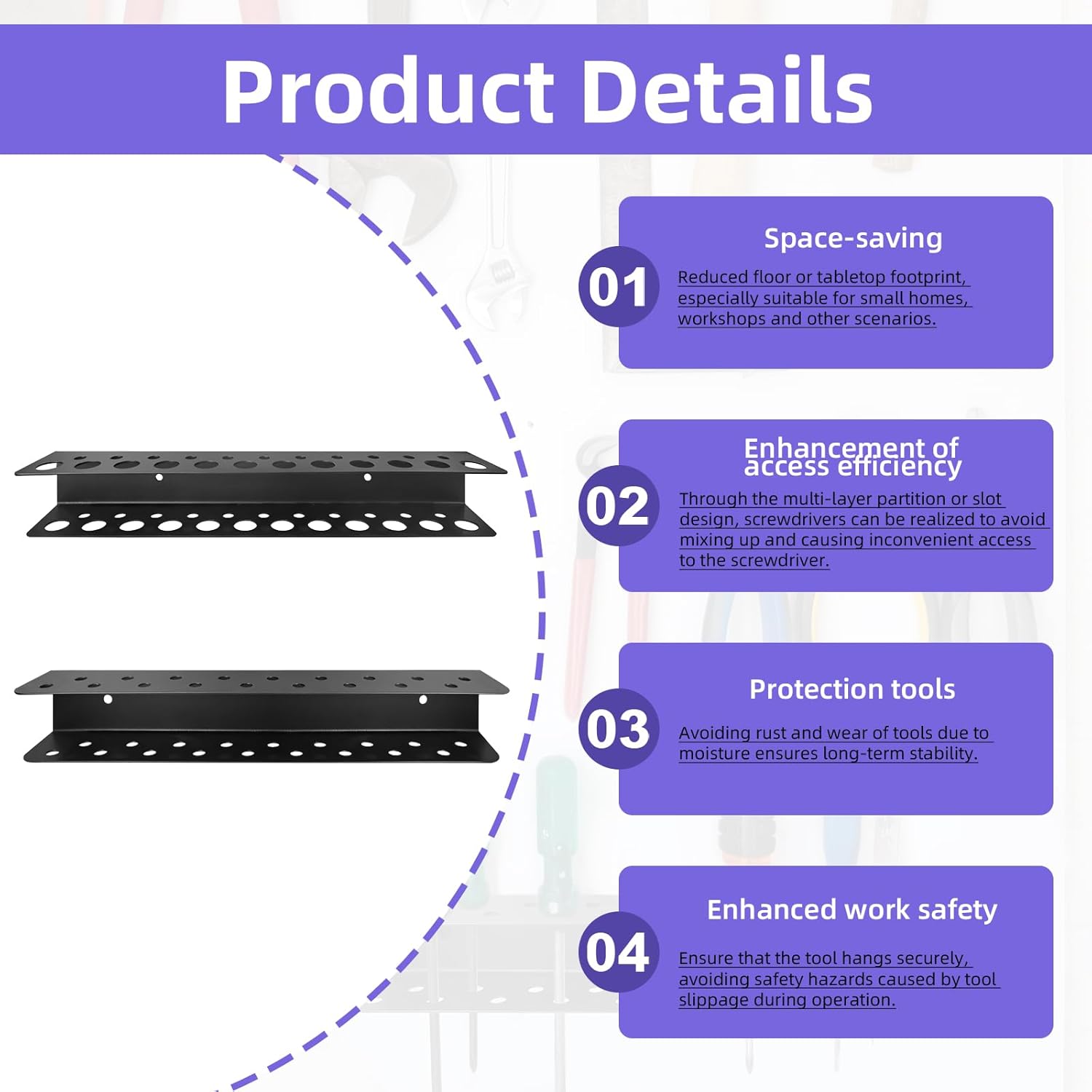 - Quick & Easy Installation – Mount securely in minutes with pre-drilled holes (compatible with screws or adhesive strips) to save wall space and keep tools within reach