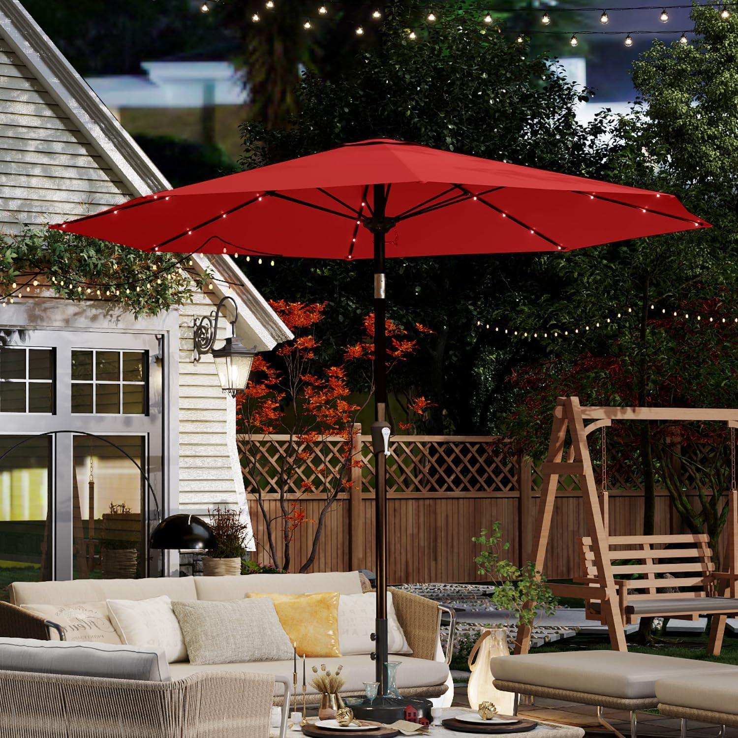 10FT Solar Umbrella 32 LED Lighted Patio Umbrella Table Market Umbrella w/Tilt and Crank, UV-Resistant Outdoor Umbrella for Pool, Garden, Deck, Red
