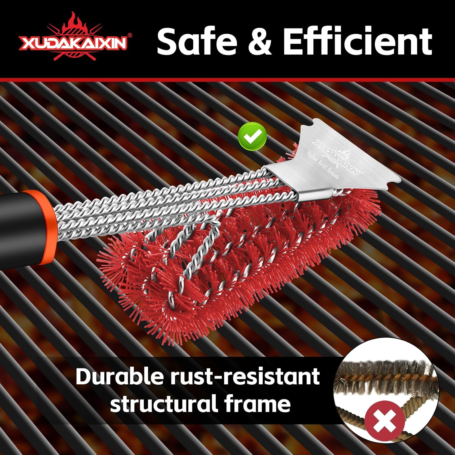 Grill Brush and Scraper, Safe Nylon Bristles Barbecue Triple Scrubbers Cleaning Brush for Cast Iron Grates/Porcelain/Weber Gas/Charcoal Grill,Extra Strong BBQ Cleaner Accessories (Red)