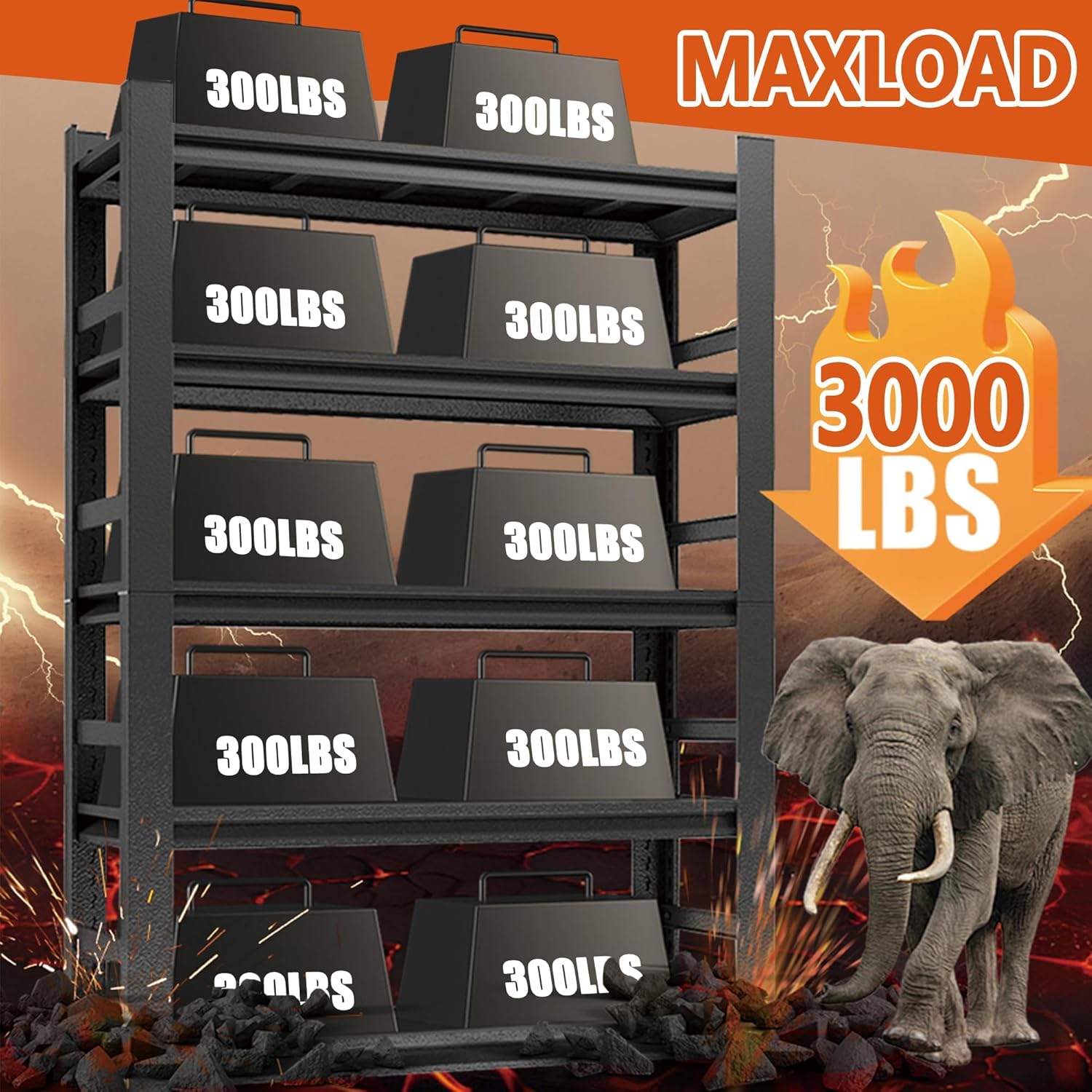- ใHeavy-Duty 3000lb Garage Shelvingใ Our heavy duty garage shelving boasts a 3000lb capacity, reinforced by double-thick steel columns. These industrial shelves provide ultimate durability for garage storage shelves, basement storage shelves, and workshops.