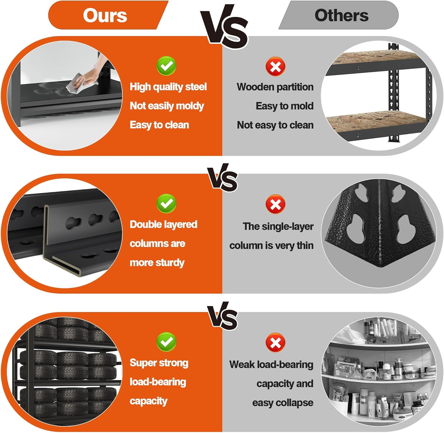 - ใAll-Steel Shelves for Maximum Stabilityใ Constructed entirely with high-quality steel shelving, these metal shelves resist bending/warping. The robust garage shelf rack design secures heavy tools and equipment with unwavering stability.