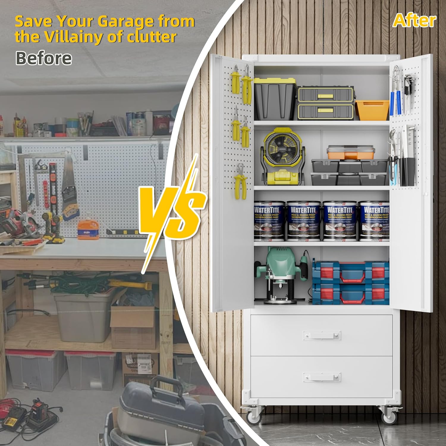- ใUpgraded Design & More SpaceใStorage cabinet offers plenty of space to meet your storage needs. There are pegboard on the cabinet 2 doors and it has 6 hooks and can be used to hang objects. The two drawers at the bottom can store sundries or documents.