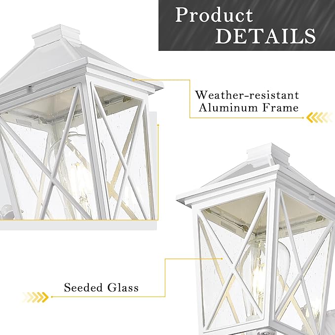 - Rust Resistant Wall Mounted Porch Light : Wall sconce with seeded glass and white finish, making charming Iighting effects ,ideal for various outdoor spaces, these patio wall lights beautifully retro styles. Perfect for frontdoor,porch, doorway, garage, backyard, hallway, patio, foyer, and entryway.