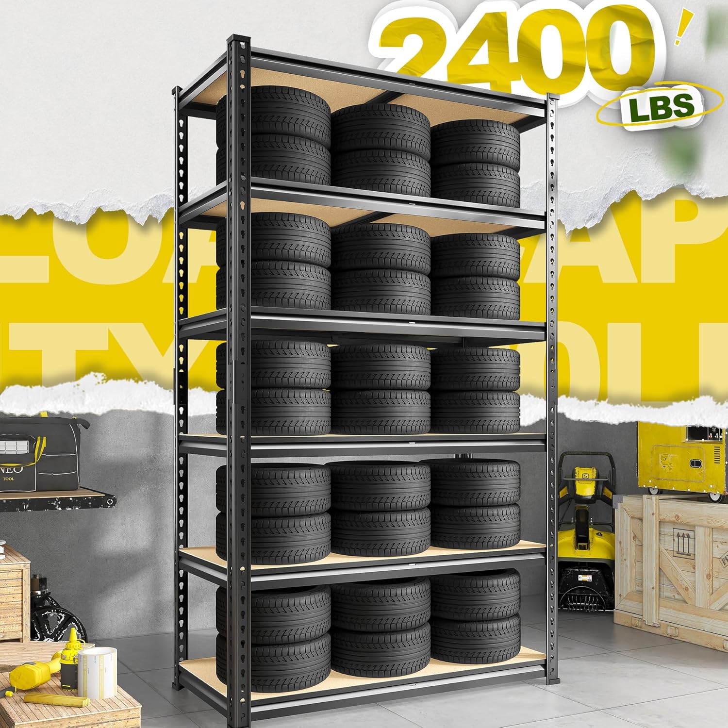 - ใ2400LBS Garage Storage Shelves with Rolled Edge DesignใThe storage shelf is constructed from 5mm MDF and thickened metal frame. Rolled edge design of the metal column is not only thicker and better quality of the column, but also protect your hands from scratches. Each shelf with 1 rib beneath, each layer can hold up to 400LBS, with a total bearing capacity of 2400LBS. The robust design allows the garage storage shelves to stably hold various heavy items, making it easy to keep your space neat and organized