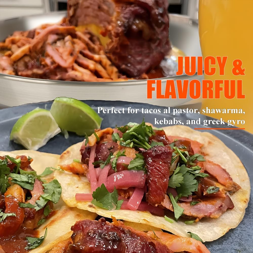 - Perfect for Making Tacos Al Pastor, shawarma, and Gyros at Home: With our vertical skewer, you could just use your oven or your regular Grill to make restaurant-style Gyros, Al Pastor, Shawarma, Doner, Kebabs, Whole Chicken, Fish, even Brazilian Churrascaria dishes right on your own grill or oven. No Rotisserie is needed to make the most flavorful meat you've ever tasted