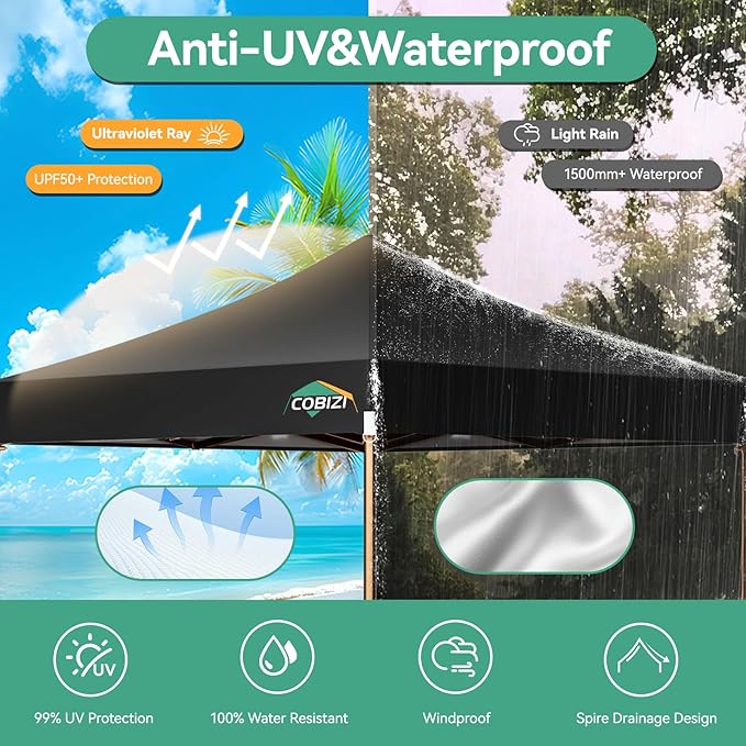 - [Premium Quality Fabric] 10x15 pop up canopy tent is made of 420g waterproof oxford fabric. The top fabric is coated with two layers of PVC with heat-sealed seams waterproof strip technology, 100% waterproof and blocks 99% UV rays.PVC coated top fabric has better light transmission than other silver coated top fabrics on the market, the tent space is more transparent.