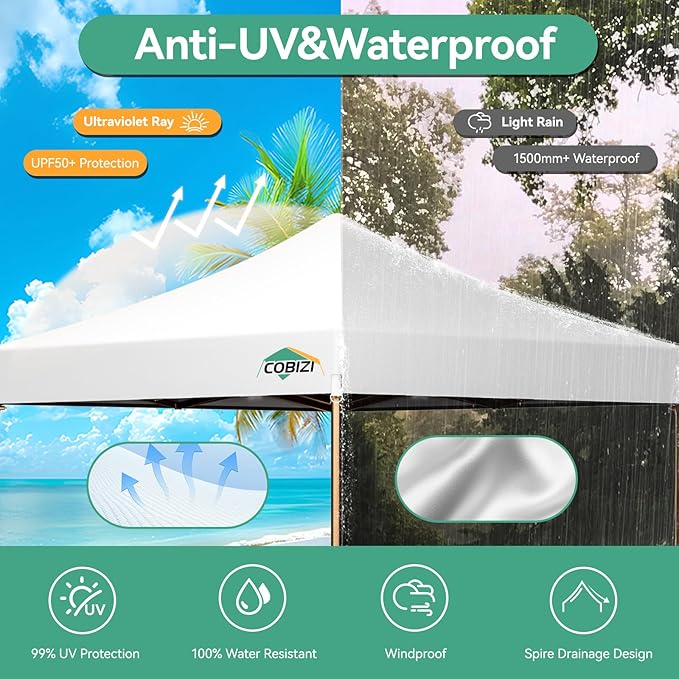 - [Premium Quality Fabric] 10x15 pop up canopy tent is made of 420g waterproof oxford fabric. The top fabric is coated with two layers of PVC with heat-sealed seams waterproof strip technology, 100% waterproof and blocks 99% UV rays.PVC coated top fabric has better light transmission than other silver coated top fabrics on the market, the tent space is more transparent.