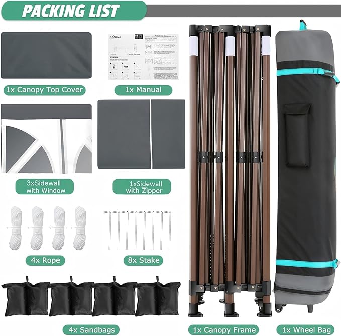 - [Included Accessories, Warranty Service] 1x Commercial Grade 10x15 Pop Up Tent Frame, 1x 420D Top Cover, 3x Window Sidewalls, 1x Double Zipper Door Sidewall, 8x Ground Pegs, 4x Windproof Ropes, 1x 1080D Rolling Bag, 1x Manual.We provide 1 year warranty service. If you have any problems and questions, please feel free to contact us, we will give you the best help. Choosing us means choosing a comfortable life.