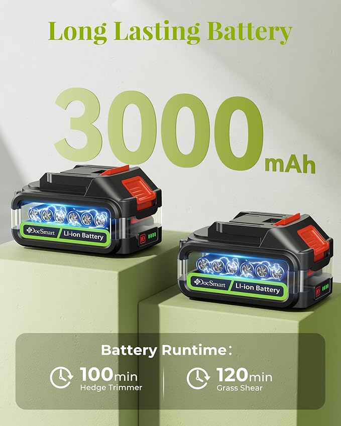 - One-hand Operation: DocSmart hedge trimmer comes short blade fully assembled with oil pre-coated to reduce wear and tear, simply plug in the fully charged battery and start using it. Ergonomic and non-slip handheld design ensures a comfortable grip and easy control. It can be used with one hand( 2.7 lbs), and it is not easy to get tired after long-term use. User-friendly for family and temporary work, even the elderly can easily control it