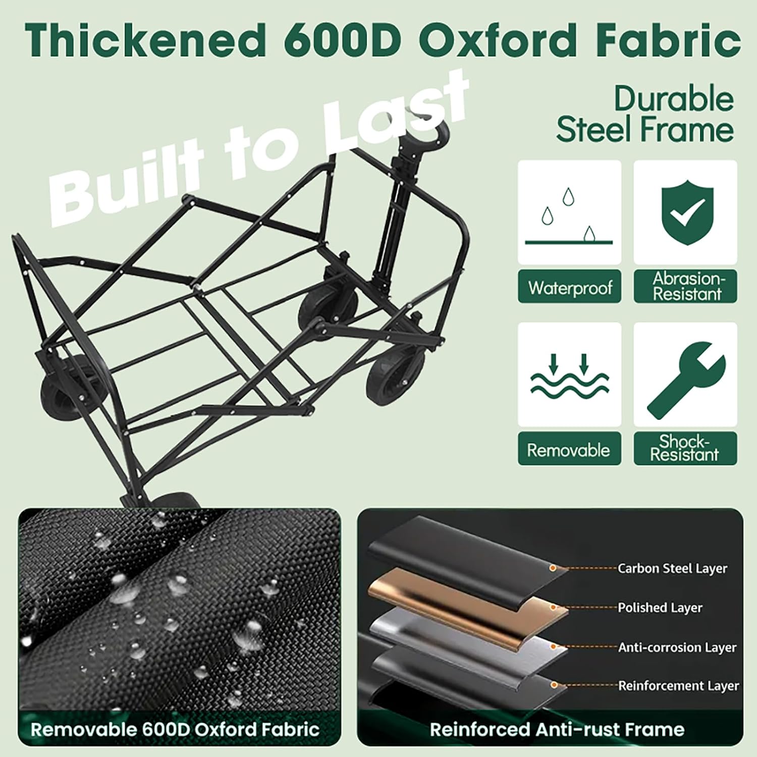 - 【Sturdy & Waterproof Premium Materials】: Made of high-quality 600D premium Oxford fabric, it can hold 370LBS load capacity. The wagon cart is sturdy, long-lasting and water, scratch, tear and wear resistant. Easily handle severe weather and heavy loads conditions. Enjoying outdoor activities with peace of mind
