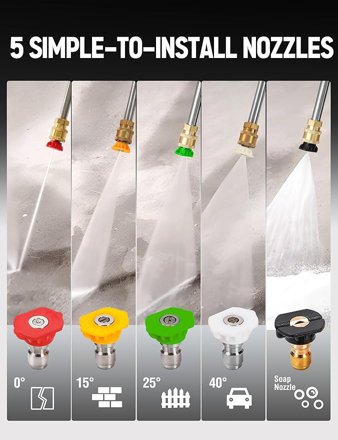 - High-quality and complete accessory set: 35ft High-pressure hose,spark plug sleeve, lever, funnel and needle insertion, 0ยฐ, 15ยฐ, 25ยฐ, 40ยฐ, foam nozzle.