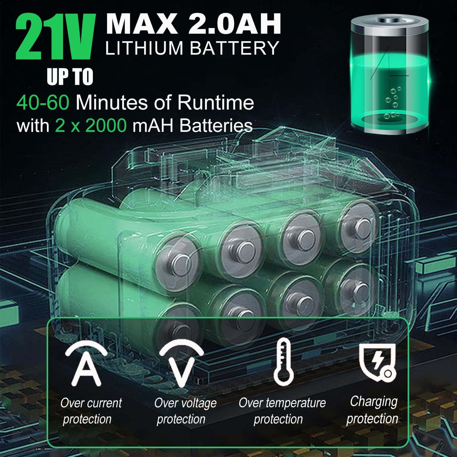 - DUAL HIGH-CAPACITY BATTERIES: Say goodbye to battery worries! cordless weed trimmer provide 2 powerful 21V 2000mAh batteries. This ensures hours of uninterrupted cutting, easily completing lawn trimming work. Experience endless power and seamless operation with our weed whacker battery powered