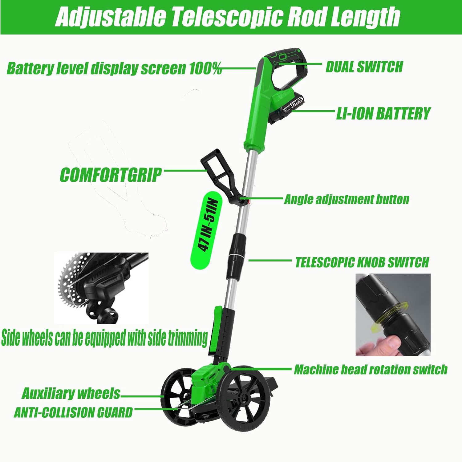 - ADJUSTABLE HEIGHT & ROTATING HEAD: The handle adopts ergonomic design Adjustable length of telescopic shaft which total length is about 41- 57inch, weight is only 4.5 pounds, The angle of the String Trimmer Cordless head can be adjusted (0-90ยฐ) at will to fit for most complex working environments. women and the elderly can easily use. allowing you to easily care for any hard-to-reach nooks and crannies