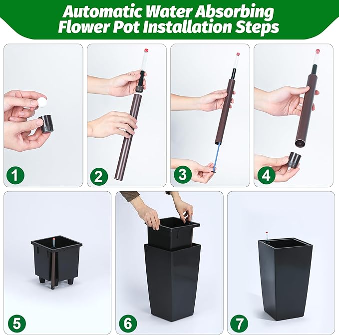 - Automic Watering System: Each tall black planters comes with built-in drainage holes and a sink to ensure that your greenery absorbs water smoothly and minimizes root rot. When the water level is low, the automatic watering system kicks in to provide your plants with the necessary moisture with minimal effort